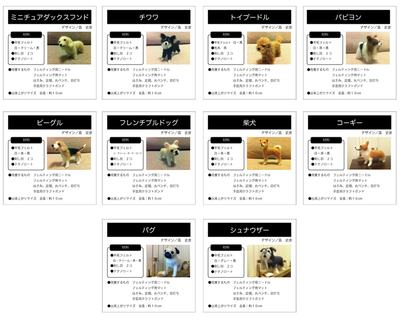 第1回目の講座は、先生のサンプルからお選びいただいた物を製作いたします。(上の10種+猫)※猫につきましては、三毛猫となっております。色の変更は、当日に変えることができます。